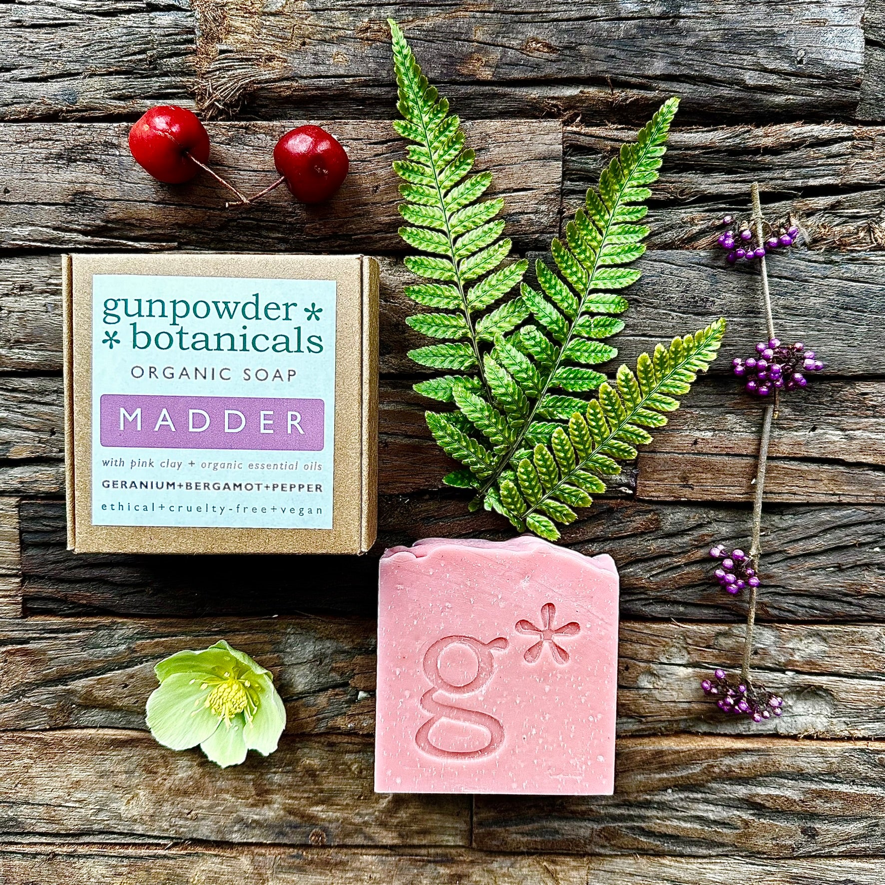 Don't get mad, get MADDER! The spicy kick of black pepper gives a deep complexity to the geranium / bergamot combination, which produces a balancing and toning effect. Pink kaolin clay gently detoxifies while improving skin elasticity and cell regeneration. The infusion of madder root and himalayan rhubarb into the organic soap oils provides a dusky rose tint to the finished bar. Suitable for both dry and oily complexions and especially recommended for mature skin.